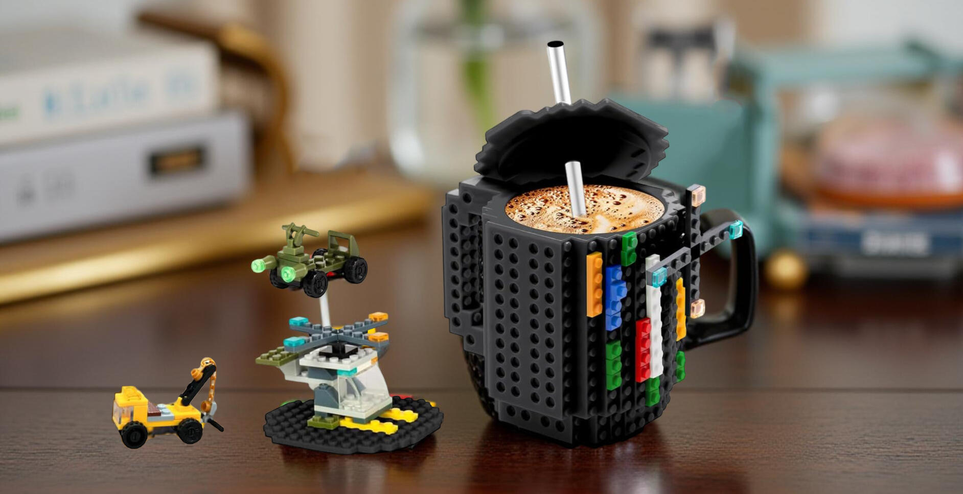 A quirky coffee mug with brick-friendly sides so you can attach building blocks while you sip. Perfect for decor, fidgeting, adding a playful touch to your morning routine.