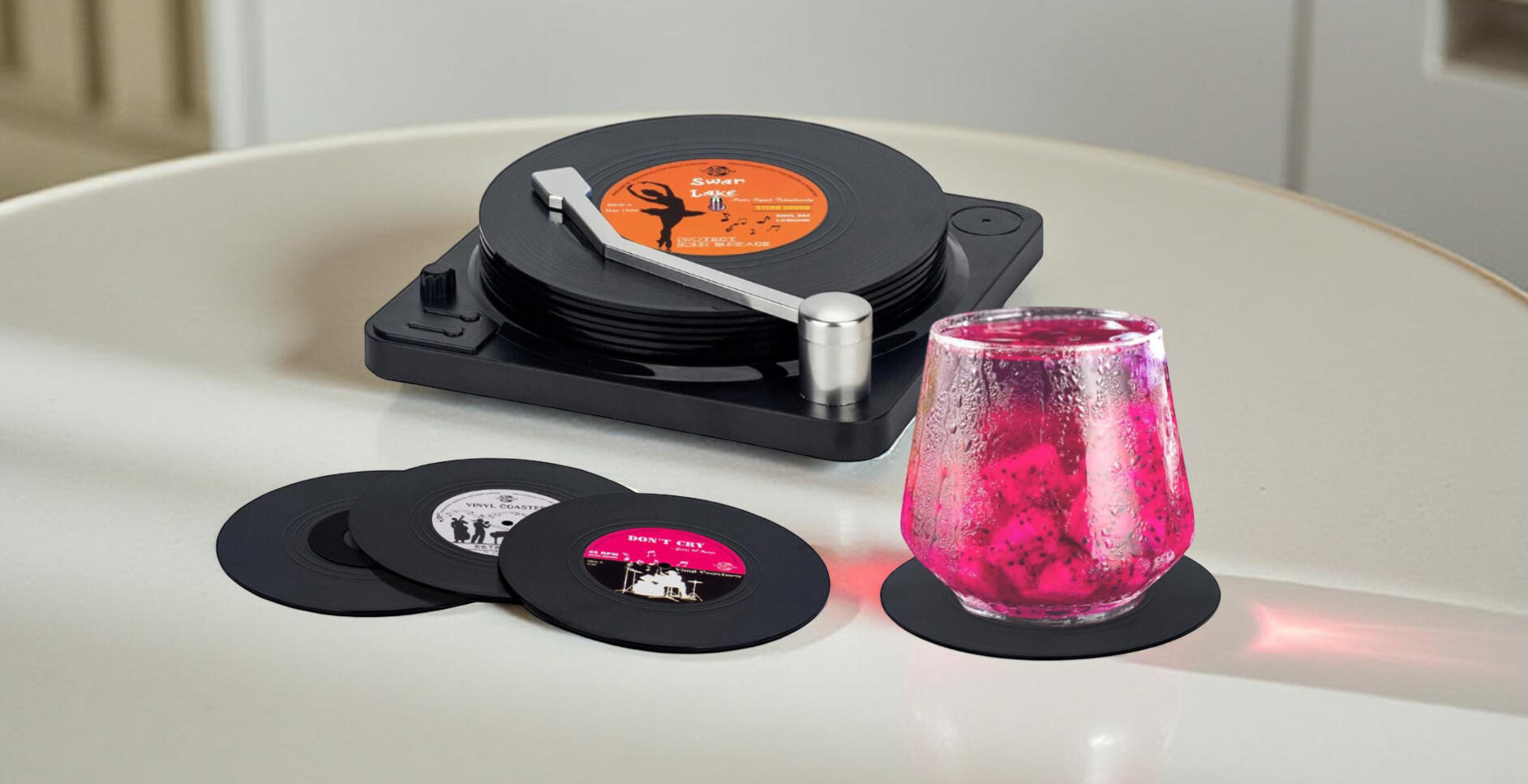 Retro-style coasters designed like mini vinyl records. They protect your table from spills while adding a subtle music-themed touch to your coffee table or bar.