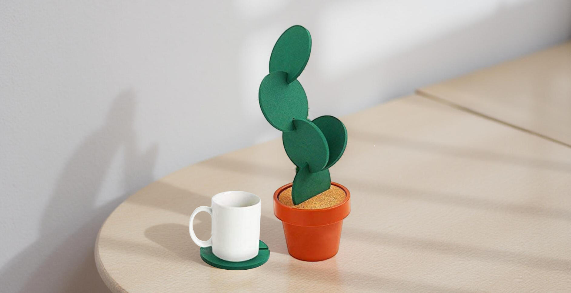 A set of drink coasters designed to look like small cactus pads, stored neatly inside a flowerpot holder. Protects surfaces while doubling as tabletop decor.
