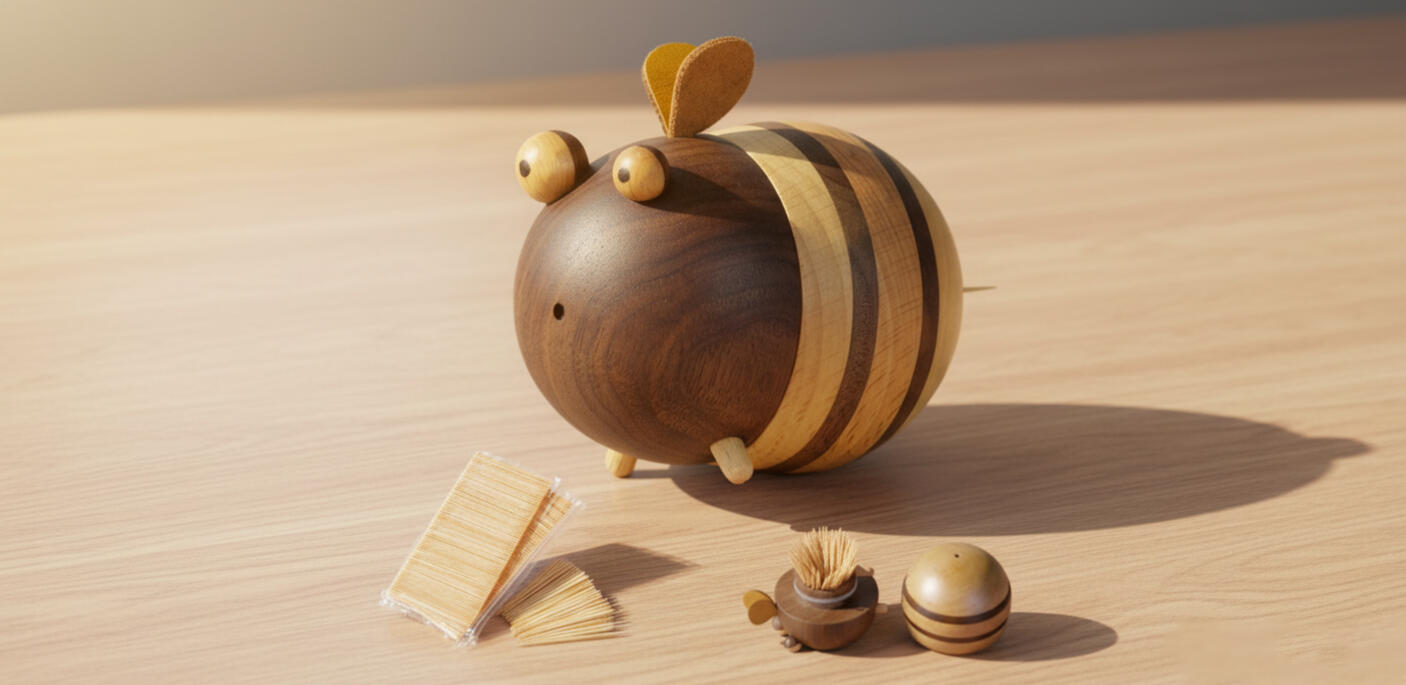 A compact toothpick holder that dispenses toothpicks one at a time when pressed. Keeps toothpicks clean, accessible and neatly stored on the table.