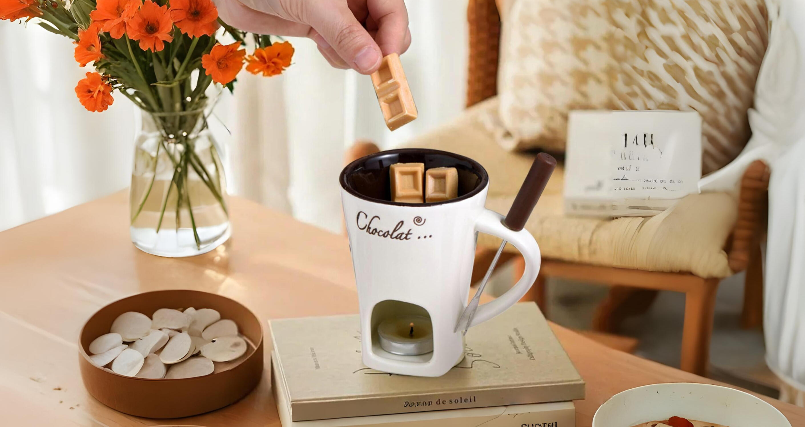 A mini chocolate fondue sweet fondue cup that is ideal for date nights, birthdays, weddings, and more. The elegant design adds a touch of sophistication to any celebration. Each set comes with a melting cup and forks, making it easy to enjoy rich, melted chocolate.